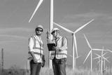 A team of Asian male engineers working together at wind turbine generator farm.