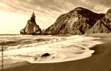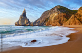 Portugal Ursa Beach at atlantic coast of Atlantic Ocean with rocks and sunset sun waves and foam at sand of coastline picturesque landscape panorama.