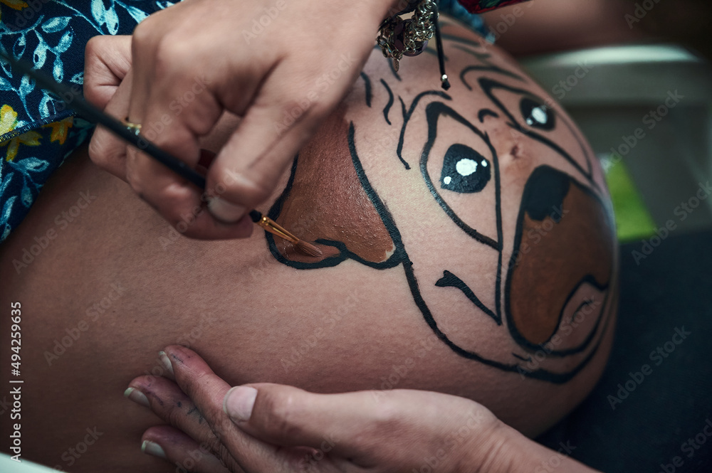 Close up of unrecognizable woman using a brush to paint and color a funny dog's face on the belly of a pregnant woman with brushes, liners and colors. She was surprised at a baby shower party.