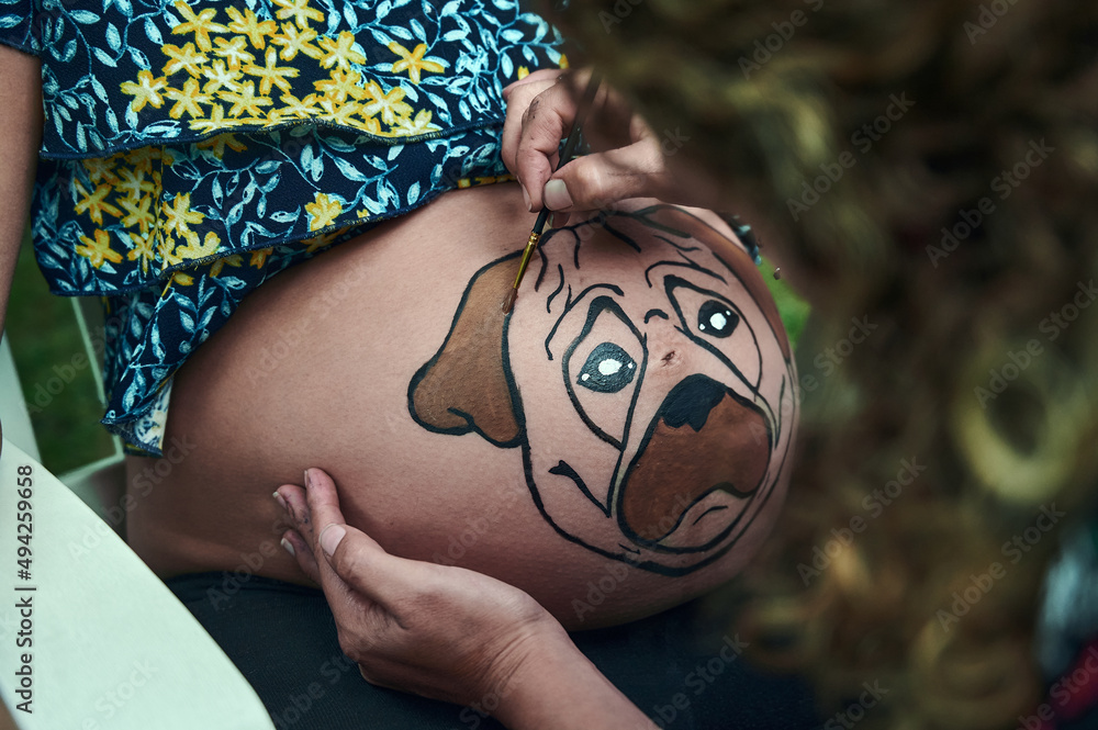 Close up of unrecognizable woman using a brush to paint and color a funny dog's face on the belly of a pregnant woman with brushes, liners and colors. She was surprised at a baby shower party.