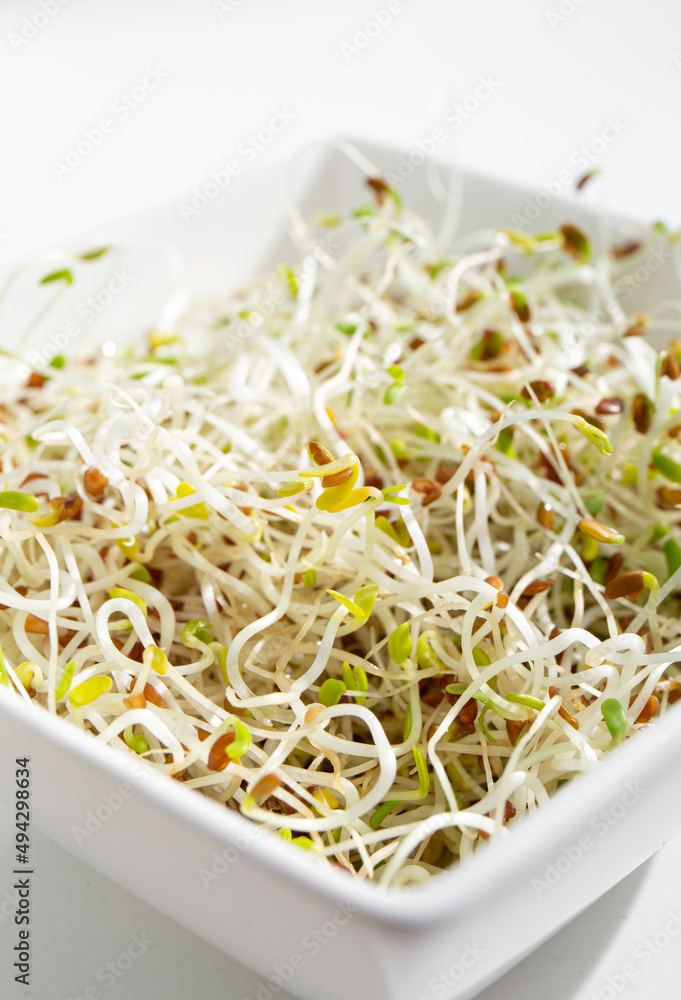 Macro photo of healthy fresh homegrown Alfalfa or Lucerne Medicago sativa sprouts in white bowl, back light. Used for for garnish or salad.