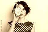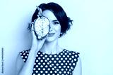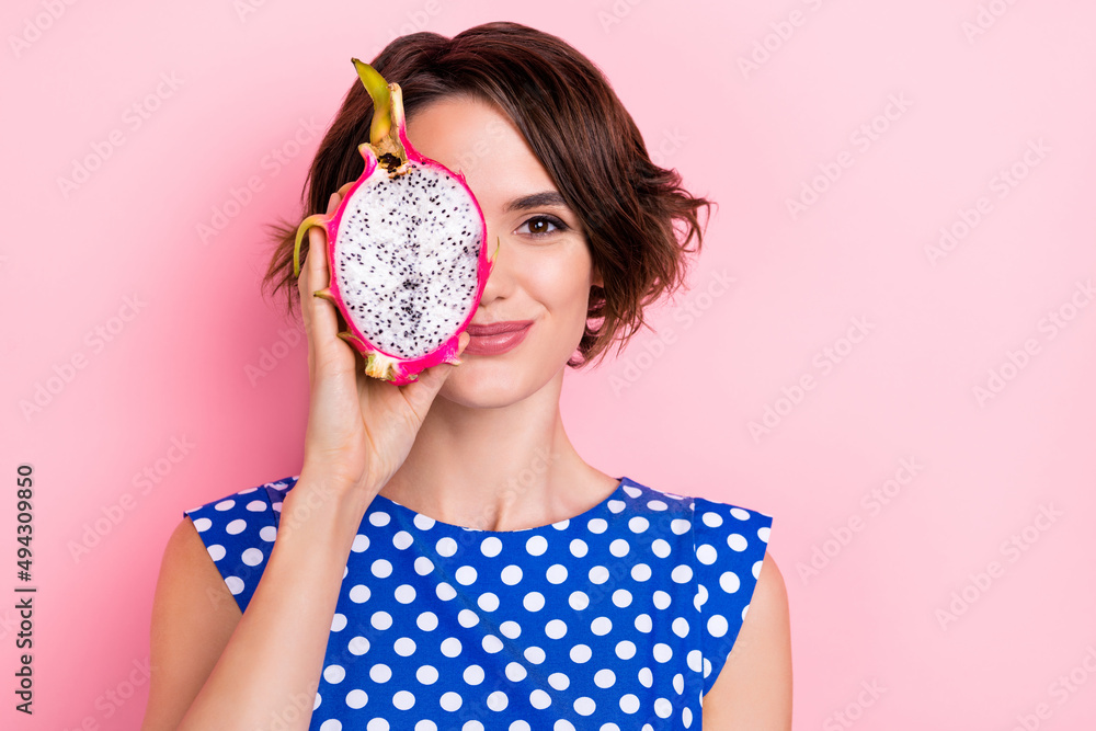 Photo of pretty millennial brunette lady show dragon fruit wear dotted blouse isolated on pink color background
