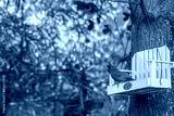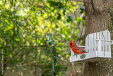 Cardinal on porch swing bird feeder in a New Orleans backyard