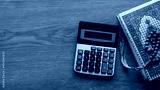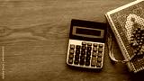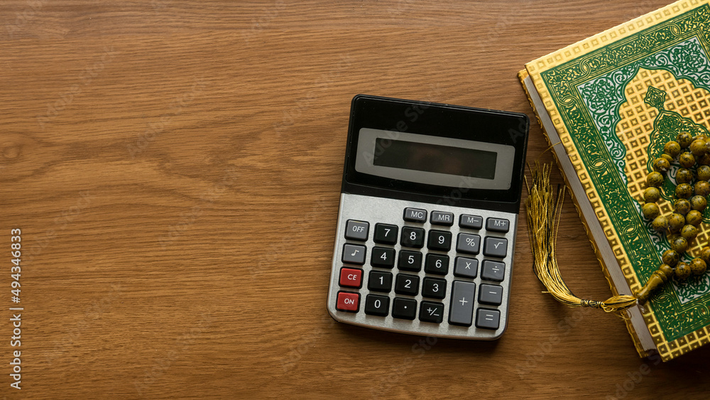 Islamic financing . Business and finance concept with calculator, Quran and rosary beads on wooden background.