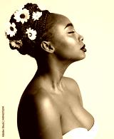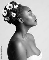 Beauty Profile of African American Woman with White Chamomile Flowers in Black Hair Braids. Fashion Portrait of Dark Skin Model over White. Wedding Make up and Bride Cornrows Hairstyle
