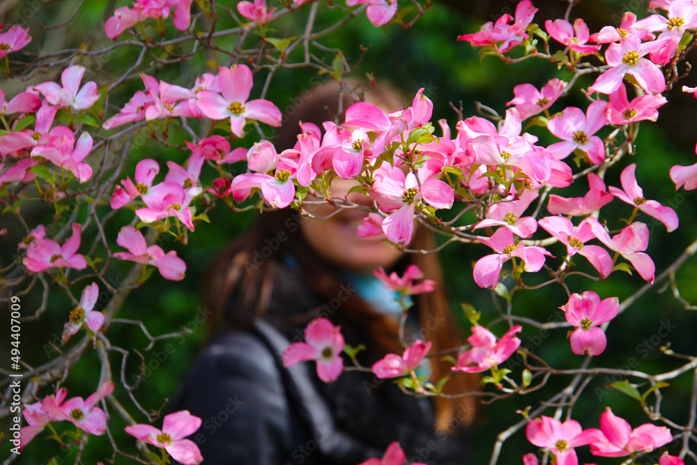 Happiness in spring - smiling woman in bokeh hidden behind pink Florida dogwood (Cornus florida) flowers (Baden, Germany)