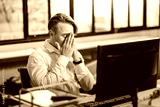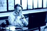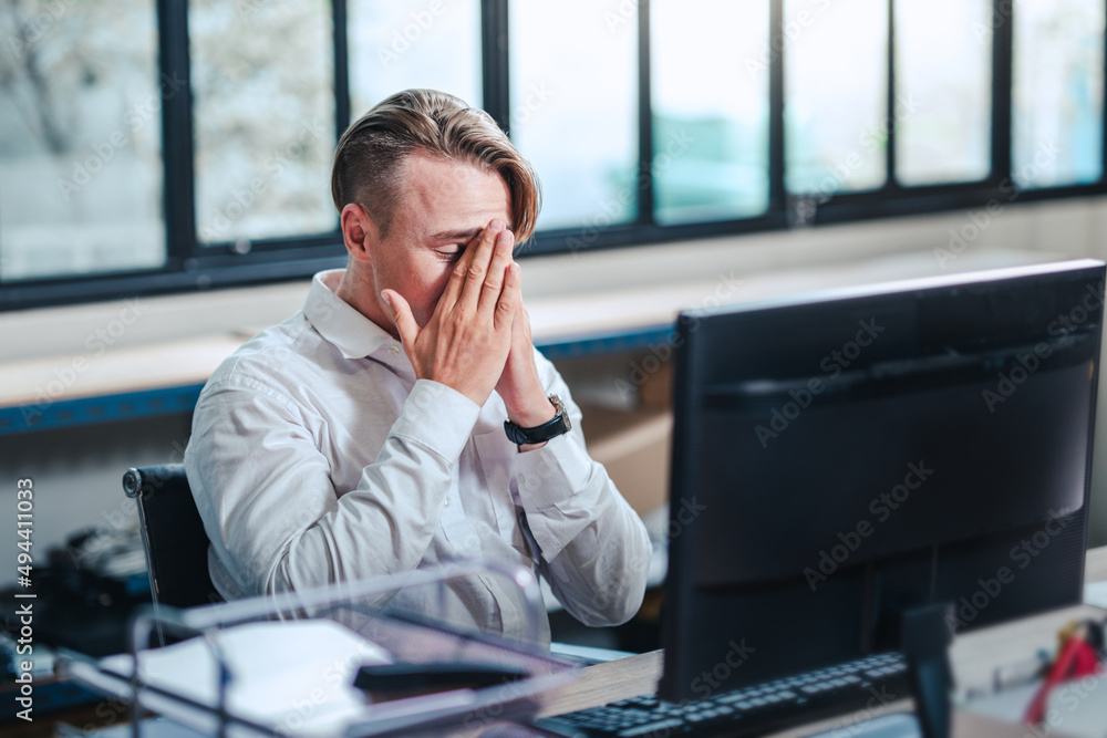 Stressful Job. Unhappy frustrated young male sitting at work desk with computer pc, Crisis And Entrepreneurship Business Issues, Headache Concept