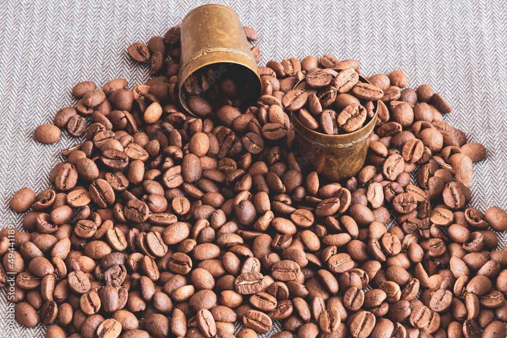 Coffee beans isolated on grey background. Overhead or top view photo of lots of or many Turkish coffee beans with copper pot.