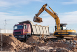 A powerful crawler excavator loads the earth into a dump truck against the blue sky. Development and removal of soil from the construction site.