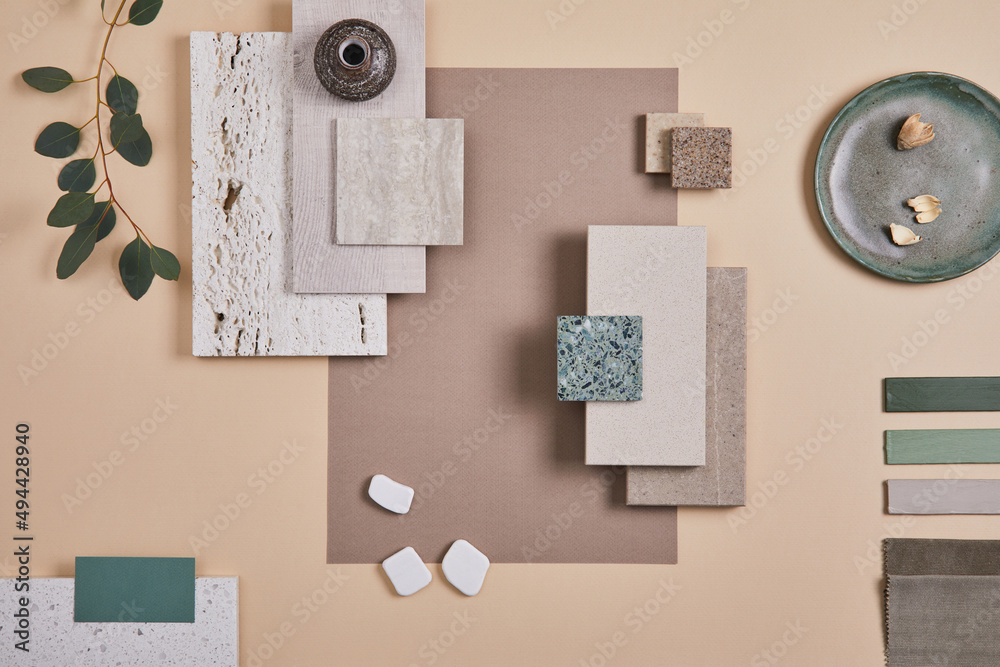 Creative flat lay composition of interior designer moodboard with textile and paint samples, panels and cement tiles. Beige, grey and green color palette. Copy space. Template.