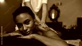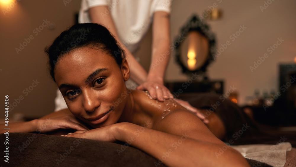 Partial image of masseur smear salt on woman back