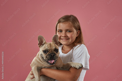 Little girl hold French bulldog and look at camera