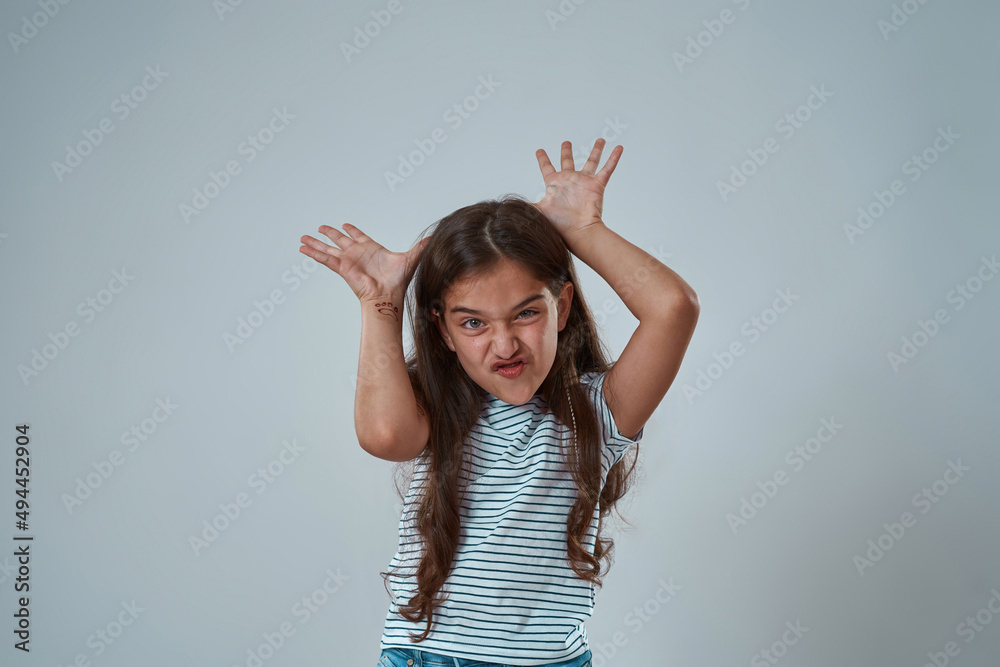 Girl with face expression showing horns gesture