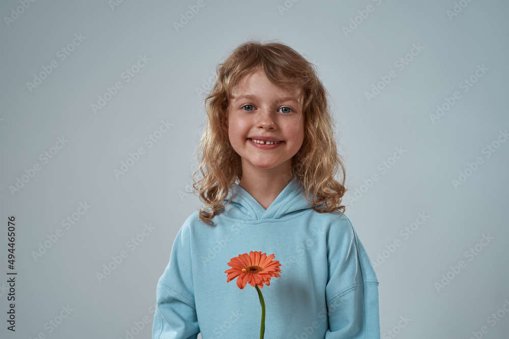 Smiling caucasian little girl with gerbera flower