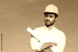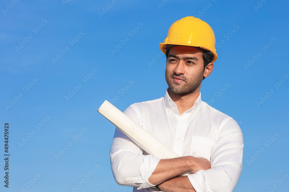 Portrait of smiling young male engineer in yellow helmet with holding blueprint in blue sky background.