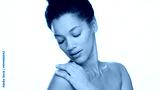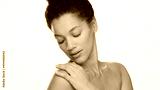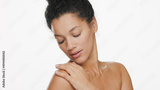 Close-up beauty portrait of attractive young African American woman strokes her bare shoulder on white background | Body care concept