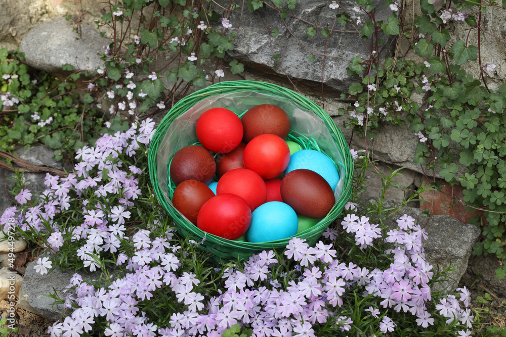 Colored easter eggs in a basket in a garden with flowers and grass