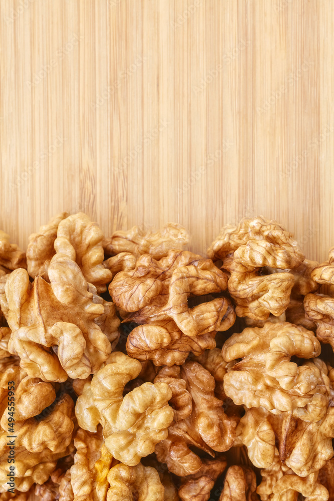 Close up picture of walnuts on a wooden background, selective focus.