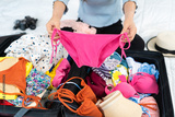 woman preparing and packing swimsuit to suitcase on bed at home, holiday travel concept