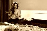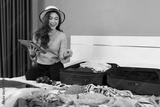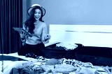 woman check a list of things with a tablet, prepare and packing clothes into suitcase on a bed at home, planning travel holiday.