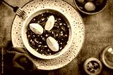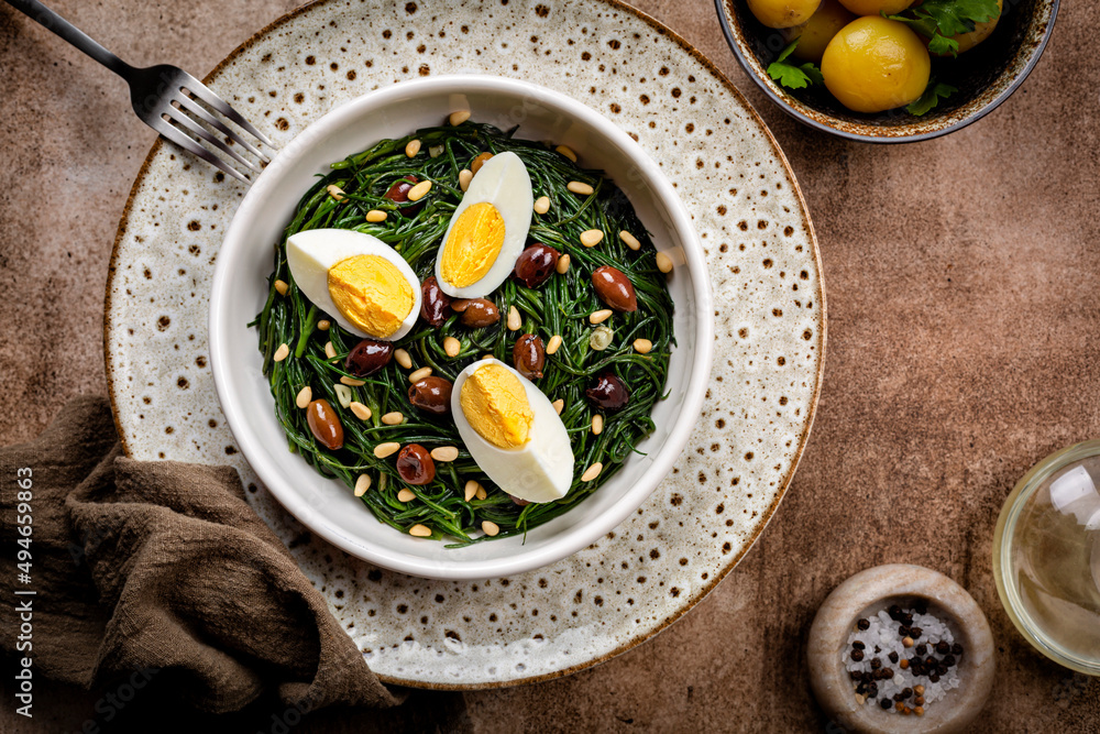 Spring Italian Salad. Sauteed Agretti with Taggiasca olives, pinoli or pine nut, and boiled eggs.