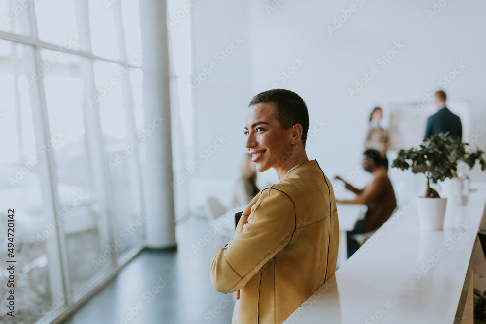 Young short hair business woman standing in office and using digital tablet in front of her team