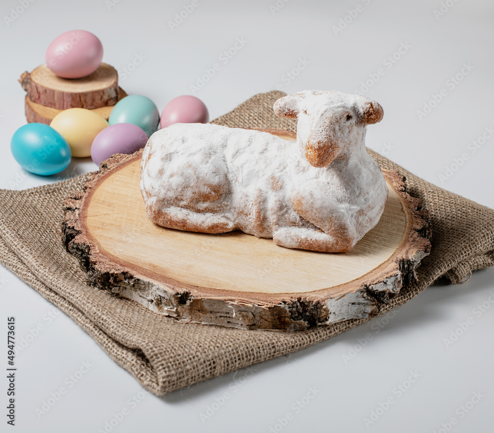 Easter sweet lamb cake, eggs, wood and sack on white background, stock photo