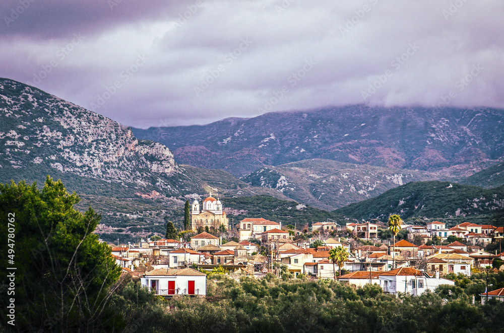 View down in valley at tile roofs of Greek village with large church in Taygetos Mountains between Kardamyli and Kalamata on Peloponnese Peninsula with foggy mountains in distance copy