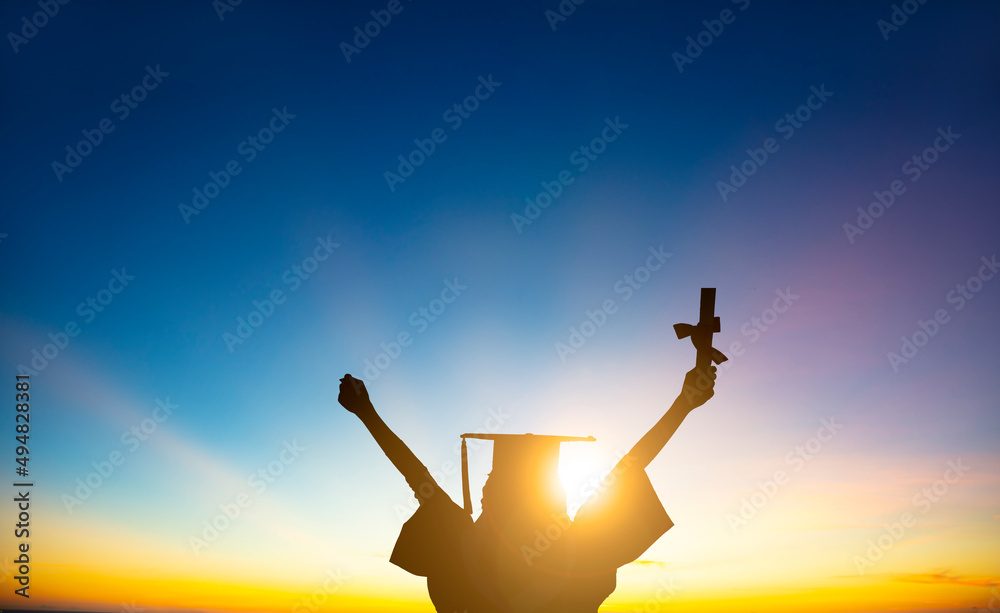 The silhouette of Student Celebrating Graduation watching the sunlight