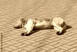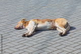 Homeless russet or brown dirty dog, cur or mongrel sunbathing on the city or town tile sidewalk or pavement in the warm clear spring or summer sunny day