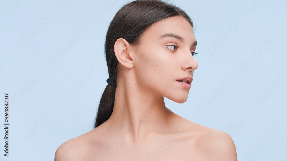 Close-up beauty portrait of young fresh-looking brunette woman with perfect skin looks aside on blue background | Skincare and beauty care concept