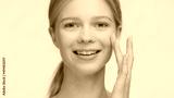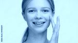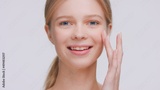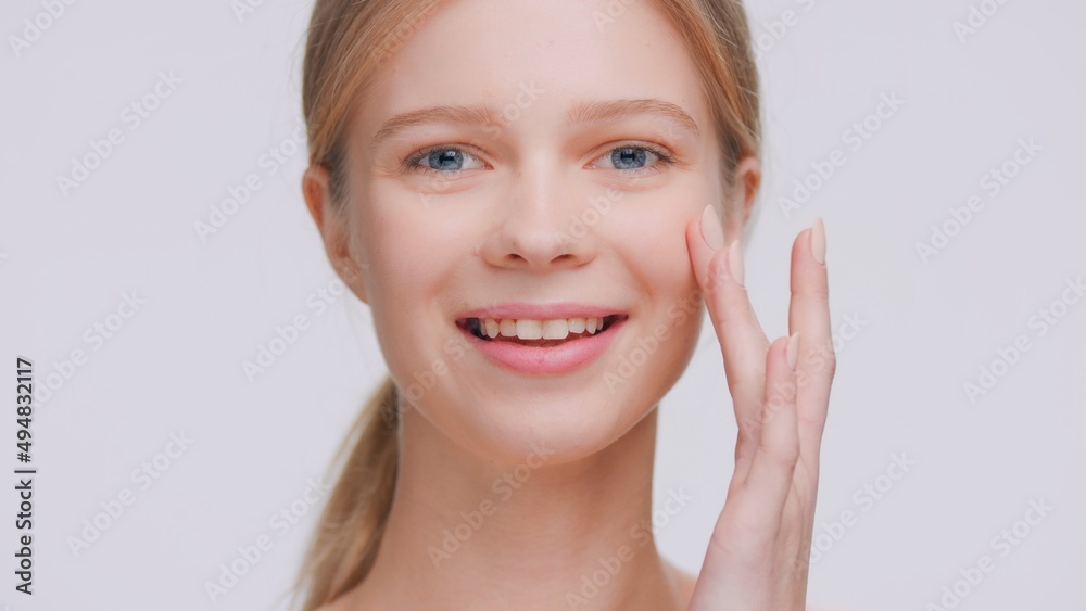 Close-up shot of young light-haired beauty model looks at the camera and twice touches her elastic skin near the cheek with her fingers | Skin elasticity and skin care concept