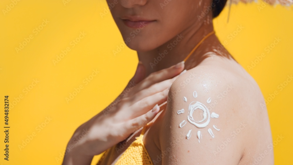 Young slim dark-haired woman in a yellow crochet swimwear and a straw hat puts sunscreen on her shoulder against yellow background | Body care concept