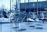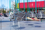 Vivid, colorful and bright urban background, scenery or view of modern carousel or roundabout with seats on chain suspensions in city park in summer or spring sunny weather