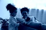 Two beautiful black girls of different age playing with their adorable wire haired Jack Russel terrier puppy at home. Loving sisters with rough coated pup having fun. Background, close up, copy space.
