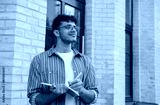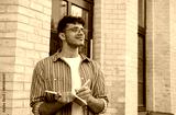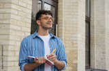 Pensive asian man writing on notebook working project. University student studying, exam preparation, taking notes in campus, education concept. Portrait of young Indian writer standing outdoors