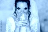 Morning of the bride. A beautiful young woman in a white coat looks into the camera, holding a silver ball.