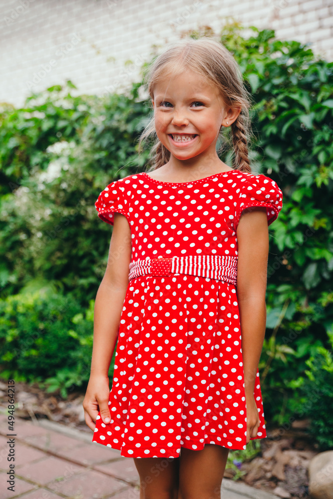 Portrait of smiling little girl in red dress walking in the garden. Summer holidays.