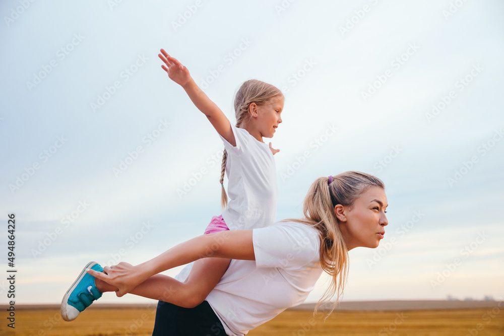 Happy mother piggyback her little daughter laughing playing and having fun together outdoor