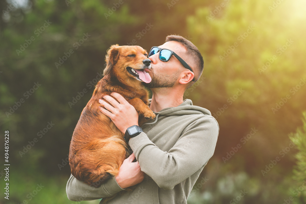 Man holding dog in his arms and kissing him outdoors. Dog and owner together. Love for pets