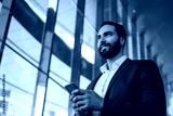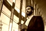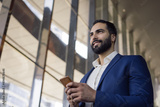 Handsome smiling middle eastern business man using mobile phone working in modern office. Confident arabian manager wearing formal wear text messaging looking at window. Successful business