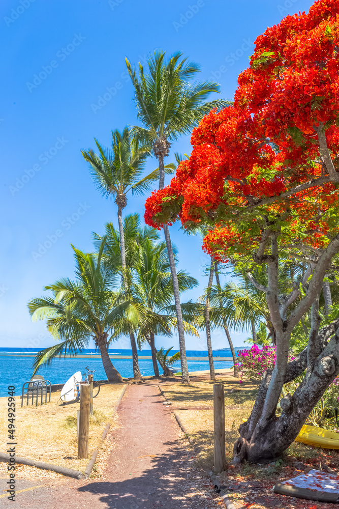 palm trees and flamboyant tree on the beach, l’Etang-Salé, Reunion island