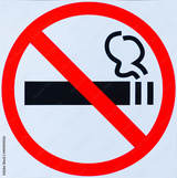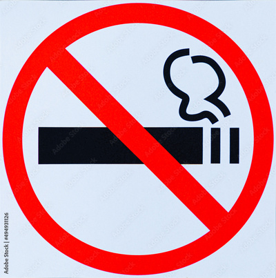 Black burning cigarette in forbidding crossed out red circle on white background. The sign, logo, embleme or simbol of no smoking area or zone
