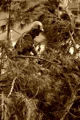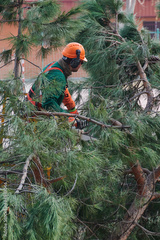 Lumberjack on a crane with a hydraulic platform reaching the branches of the trees that he has to cut down with a mechanical saw.