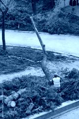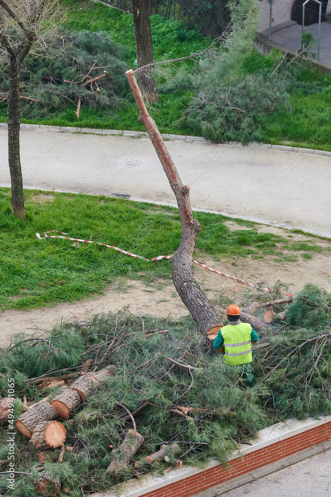 unrecognizable lumberjack cutting a tree into logs with a chainsaw and using protective clothing and gloves to prevent damages.