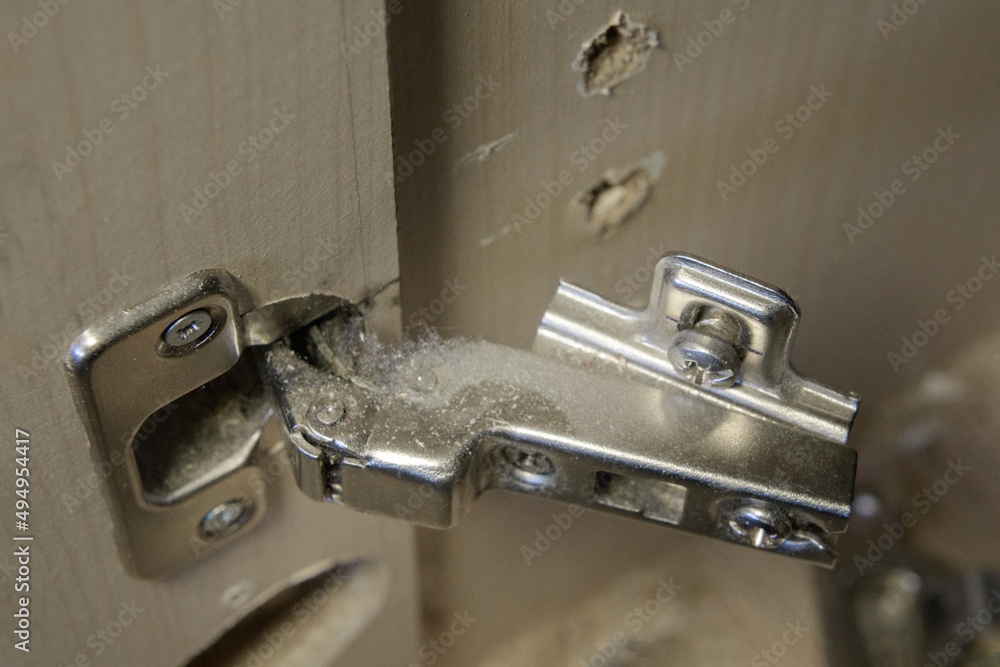 Torn-out hinge of furniture fittings. hinge fixed on a modern cabinet. Breakage of furniture fittings. Screw holes