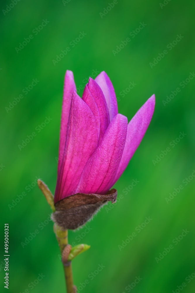 Close up of a pink flower. Beautiful magnolia with a blurry green background. Photo with shallow depth of field.
