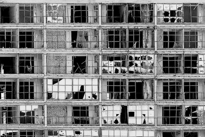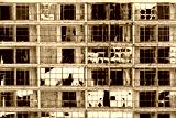 Black and white contrast monochrome background or texture of ruins of modern building or edifice facade or front