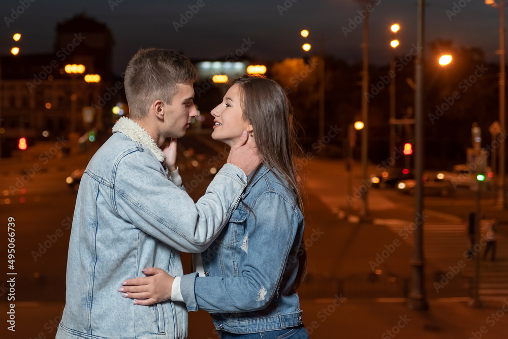 Young beautiful couple hugging on evening city background