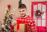 A young man in a sweater with a Scandinavian pattern in front of a Christmas tree porch. New Year